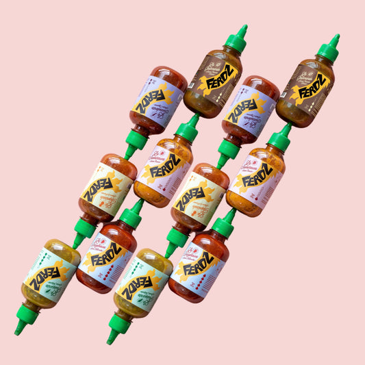 Ce coffret comprend deux sauces artisanales,l’une douce et l’autre plus piquante — ainsi qu’un assortiment de chocolats aux épices et aux fruits lyophilisés.