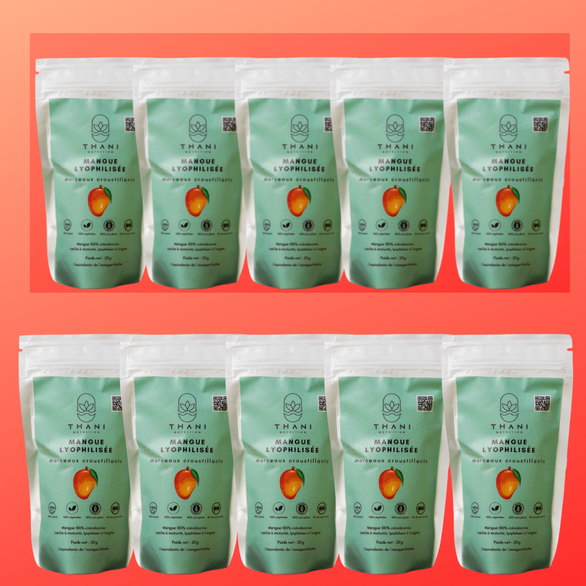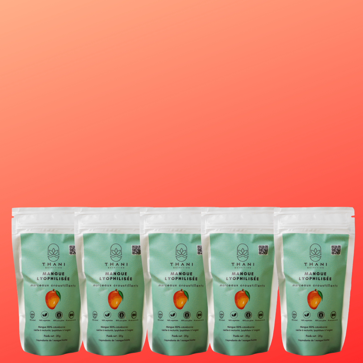 Nos mangues sont cultivées sous le soleil de Colombie à parfaite maturité pour capturer toute leur douceur naturelle. Elles sont transformées directement après la cueillette par lyophilisation, un procédé que préserve les saveurs, les couleurs et nutriments.